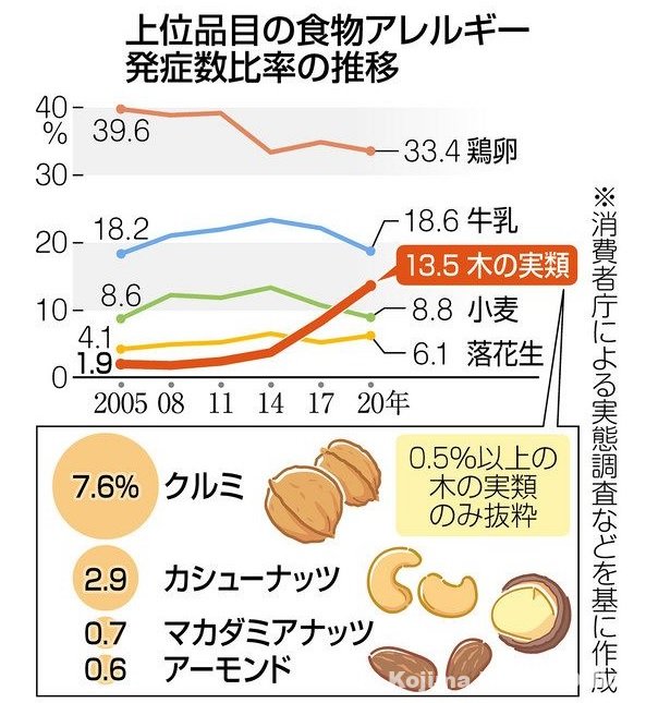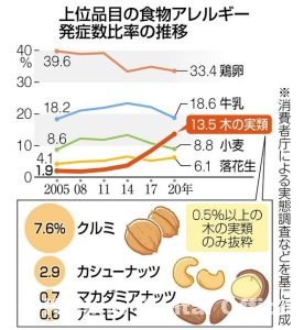 2020年の消費者庁の実態調査で、木の実類が小麦を抜いて発症数3位となった