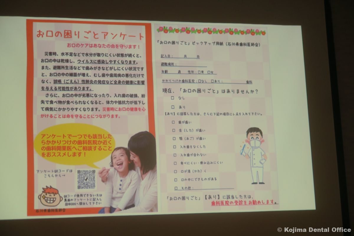 今回は、輪島市町野町の避難所で、少ない⽔でもできる⼝腔ケアを実践された廣江雄幸 ⽒、そして、仮設住宅での⼝腔状態の調査を⾏っておられる⻑⾕剛志⽒、お⼆⼈の⻭科医師をお招きして、災害時、そして震災から1年半以上が経過する中での継続的な⼝腔ケア の必要性についてお話いただくとともに、会場の皆様の疑問にもお答えいただきます。 災害時に私たちのお⼝と全⾝の健康、命を守るオーラルケア(⼝腔ケア)の⼤切さについて、医療・保健関係者、災害⽀援関係者をはじめ、多くの⽅とともに学び合う機会にしたいと思います。ご参加をお待ちしております。