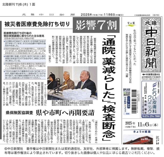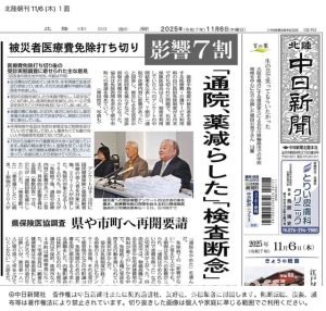朝日新聞、時事通信社、共同通信、北國新聞、北陸中日新聞、毎日新聞、読売新聞 新聞報道2025.6.5. 2025.6.26.北陸中日新聞医療費免除頼みの綱がんばろう内灘KSNJネットワーク17号ニュース