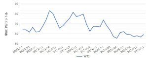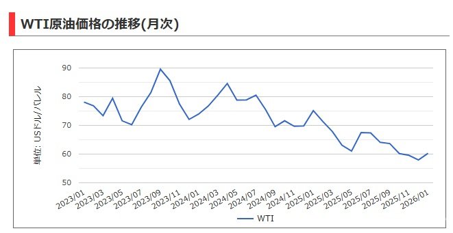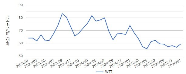 60.28 USドル/バレル (円換算: 59.40 円/リットル) ※2026年1月の平均価格