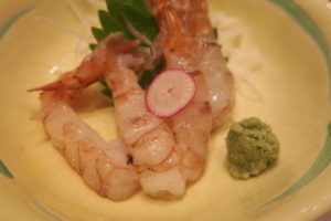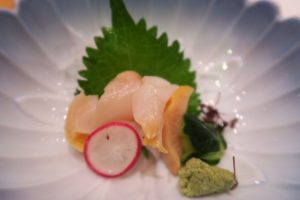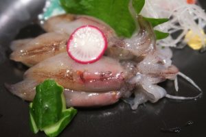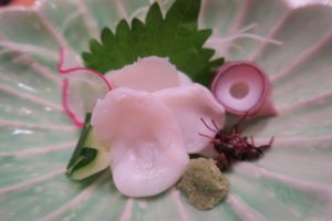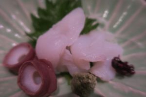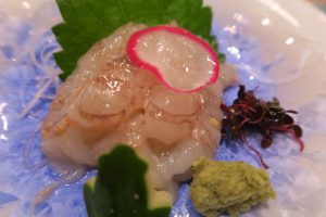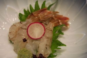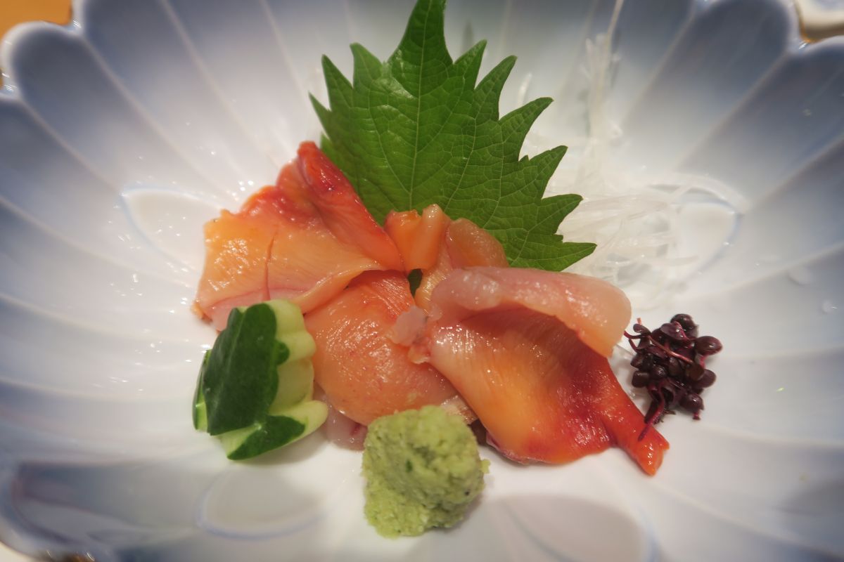 刺身 ノドグロの生と炙り、ガス海老、生ダコ、赤西貝