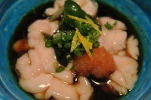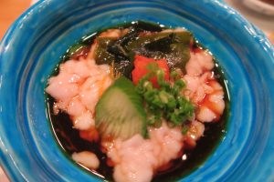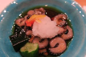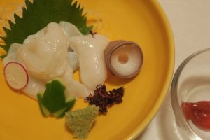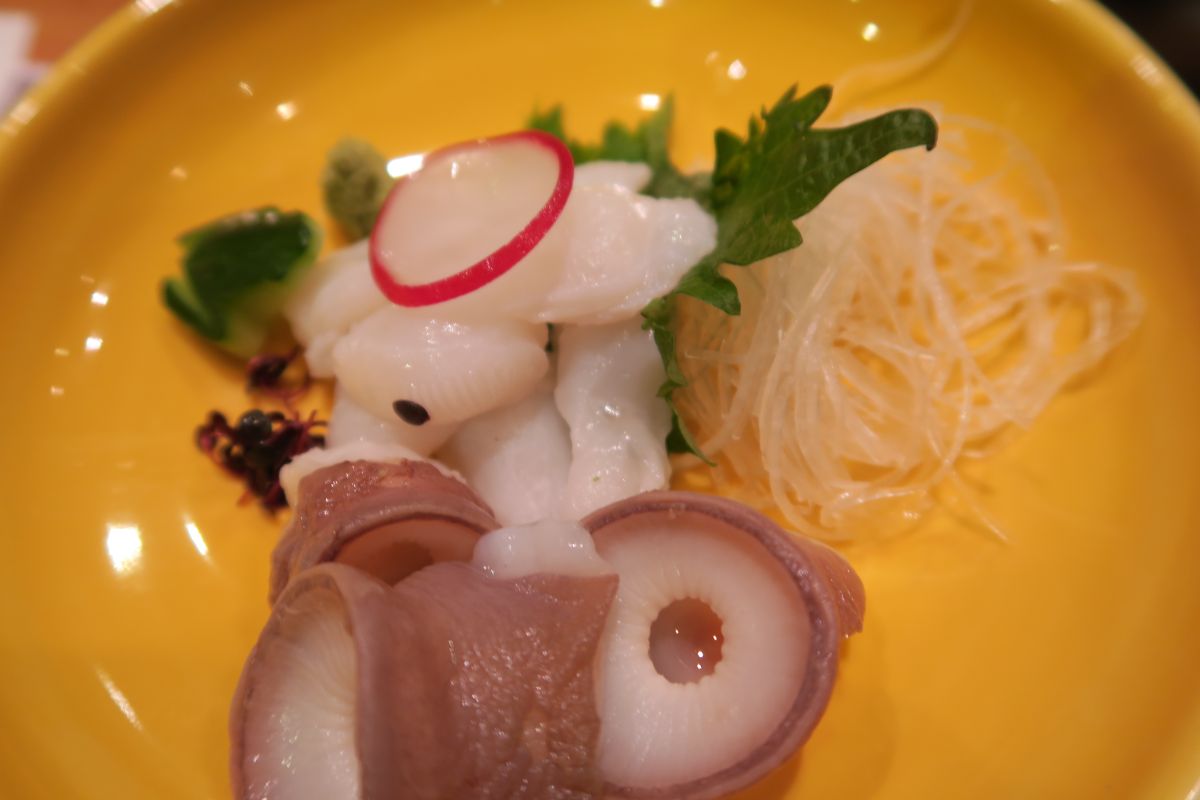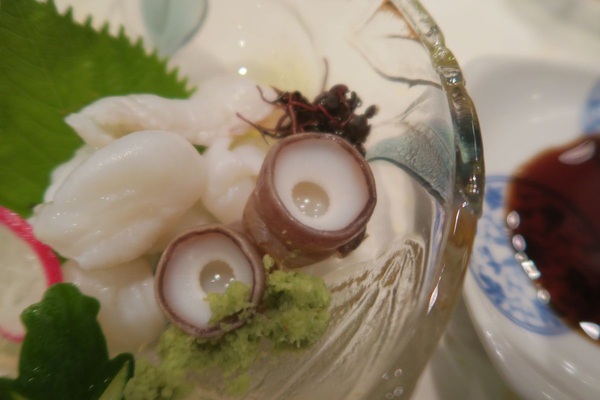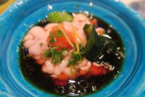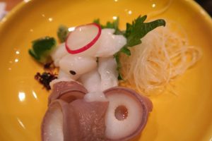 イイダコとホタルイカ、フグ白子酢、カワハギの薄造りと肝、白エビ、