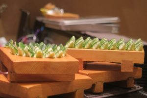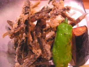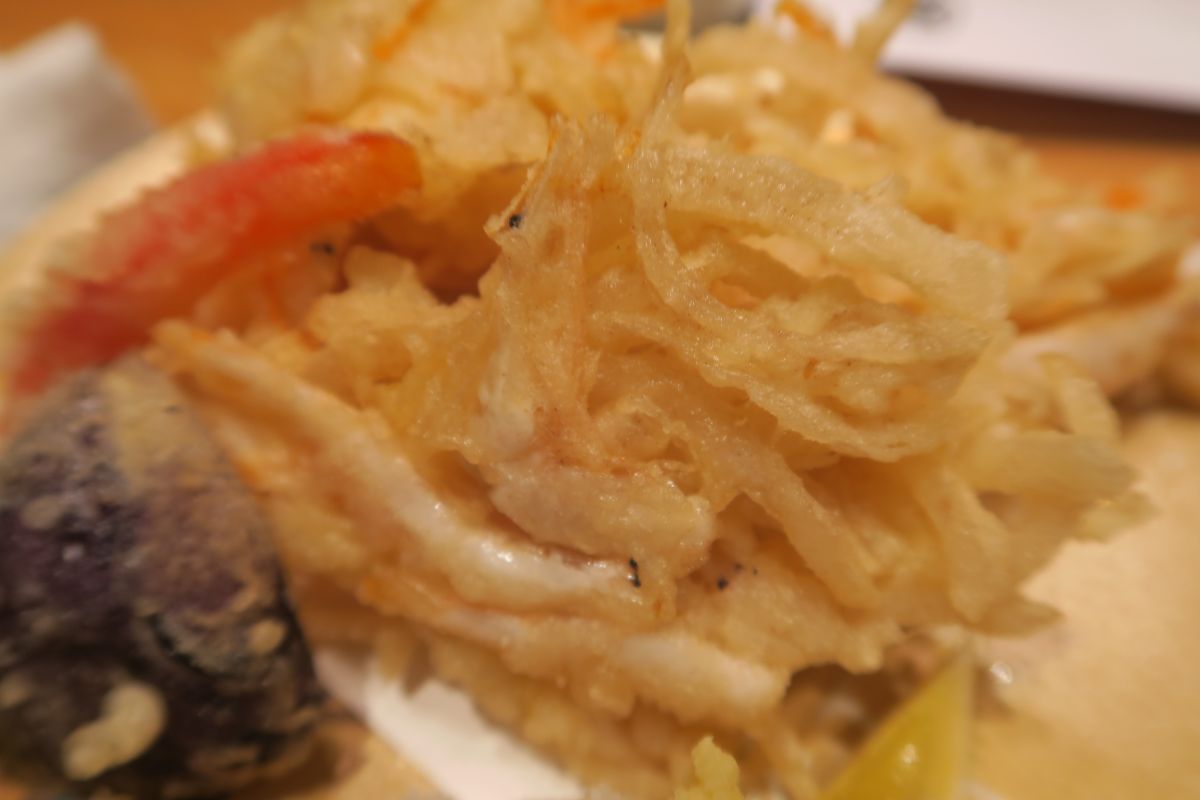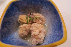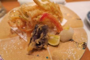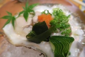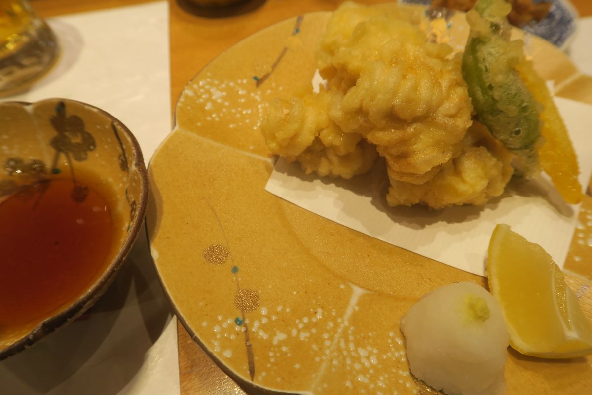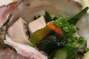 岩牡蠣、白エビの天ぷら、ふぐの白子焼き