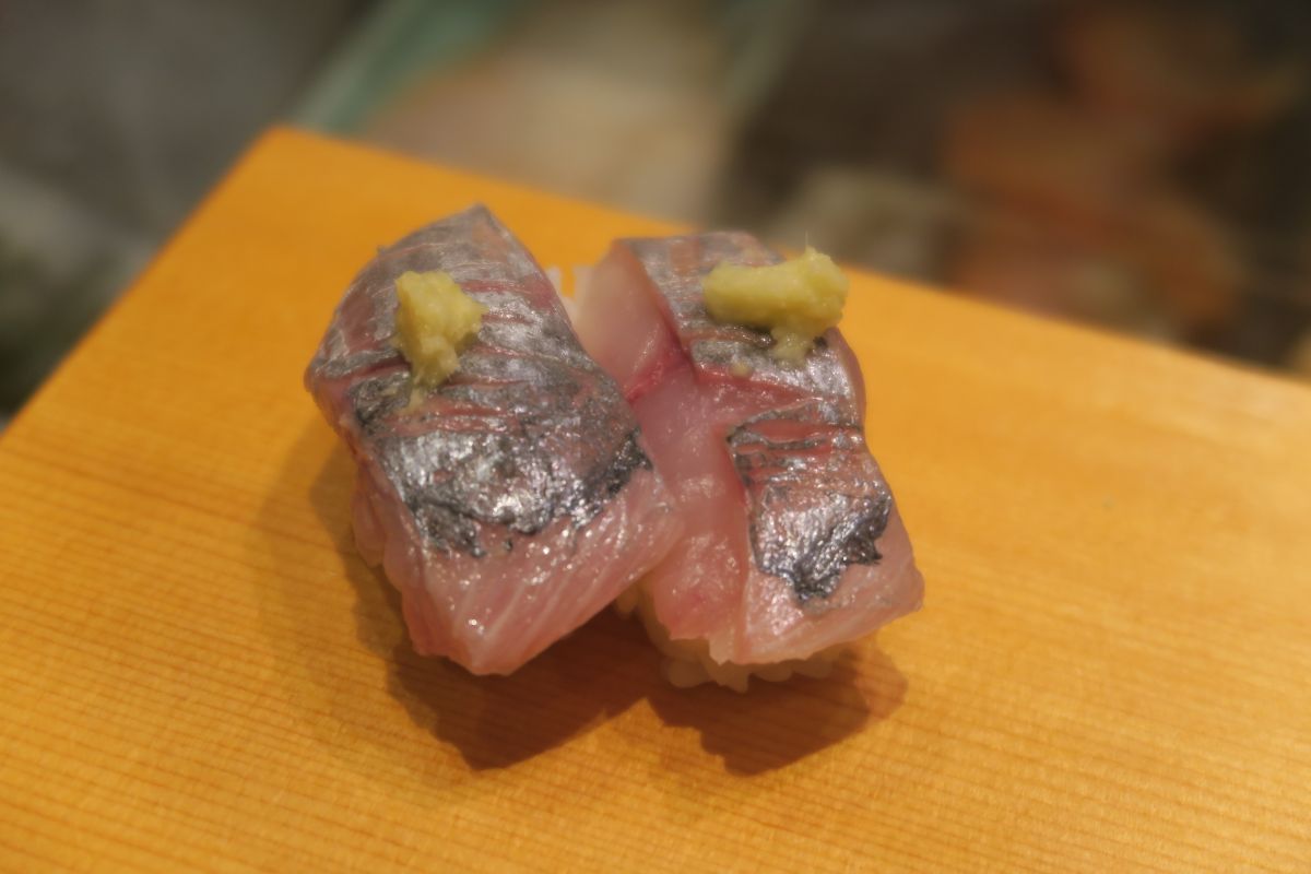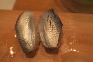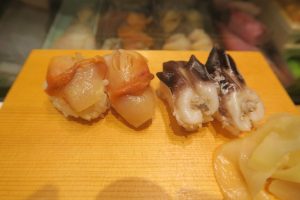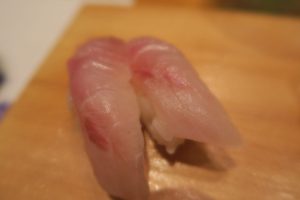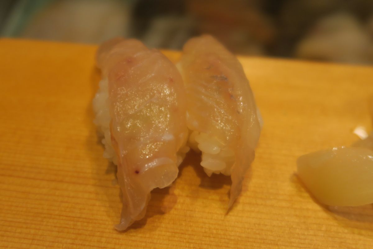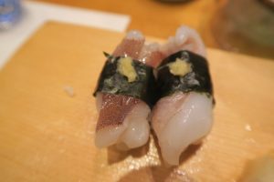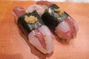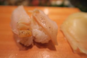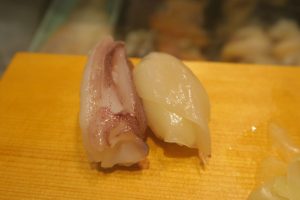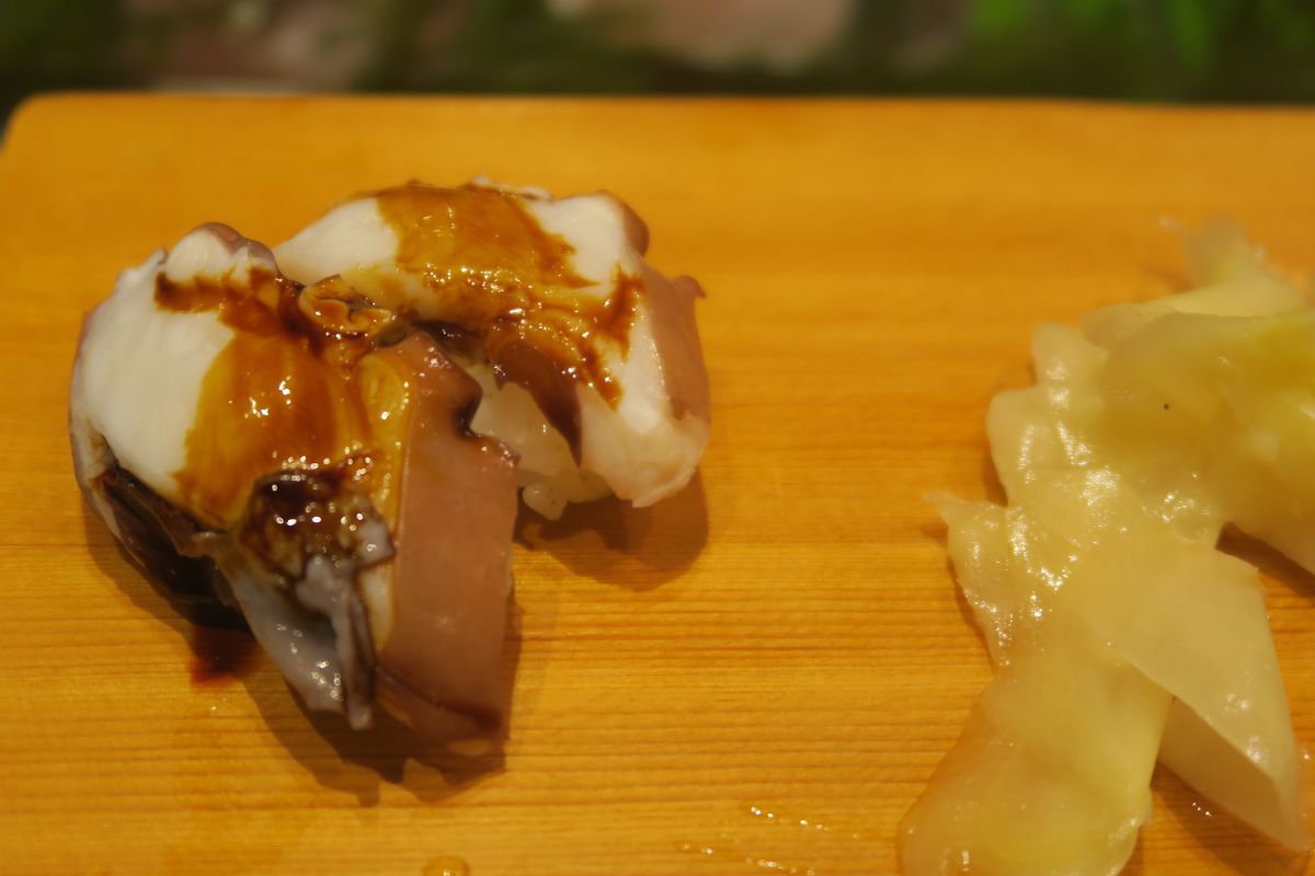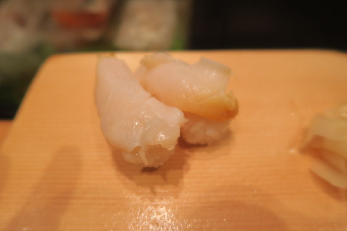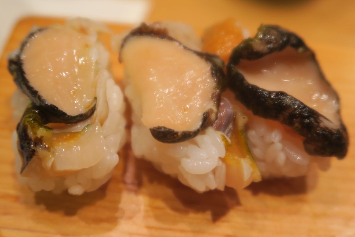 握り 赤西貝、トリ貝、鰺、ヒラメ、ゲソとミミ、ウナきゅう