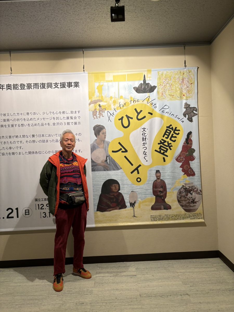 4日(木)時折、小雪が舞い散る中、石川県立美術館へ。内灘町以北の人は無料だった。令和6年能登半島地震・令和6年奥能登豪雨 復興支援特別展が、東京所在の美術館・博物館の協力を得て開催されていた。能登への思いがひしひしと感じられる。よくぞここまで集めたものだ。教科書で見るような秘蔵の作品を一挙に見ることができ、感動の連続だった。初めて見る原画も多かった。菱川師宣作の見返り美人図や尾形光琳の風神雷神図屏風。岸田劉生作の麗子微笑や黒田清輝作の湖畔、鳥獣戯画断簡、一休和尚像、雪舟や伊藤若冲、酒井抱一の絵も興味深い。長谷川等伯作の牧馬図屏風は見事、必見の価値あり。高村光雲作の老猿も迫力満点。松田権六作の双魚文漆絵皿も素晴らしい。