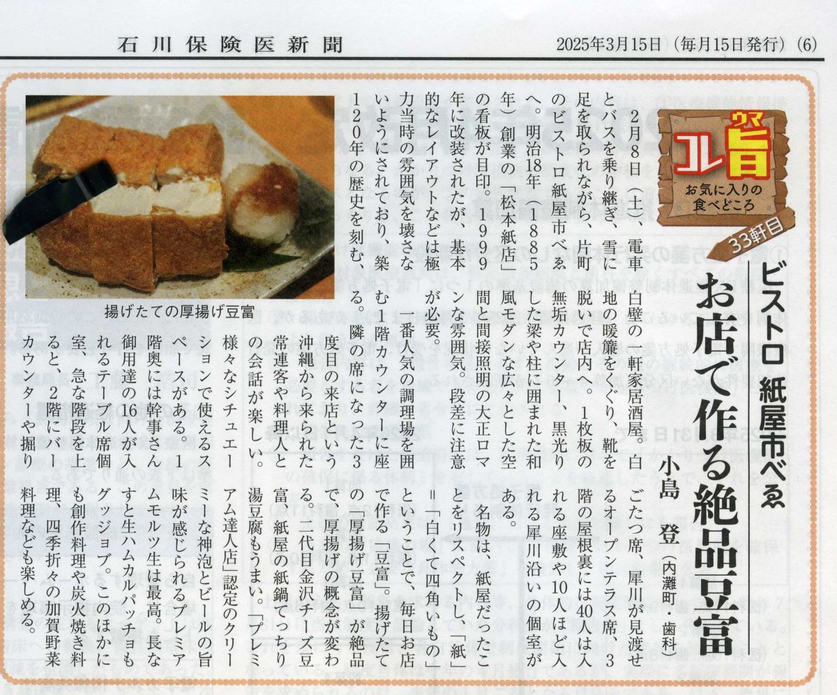 名物は、紙屋だったことをリスペクトし、「紙」=「白くて四いもの」と言うことで、毎日お店で作る「豆富」。揚げ立て「厚揚げ豆富」が絶品。油揚げの概念が変わる。二代目 金沢チーズ豆富、紙屋の紙鍋 てっちり湯豆腐も美味い。「プレミアム達人店」認定のクリーミーな神泡とビールの旨味が感じられるプレミアムモルツ生は最高。長なすと生ハムカルパッチョもグッドジョブ。このほかにも創作料理や炭火焼き料理、四季折々の加賀野菜料理などなど。後日、石川保険医新聞に掲載される。