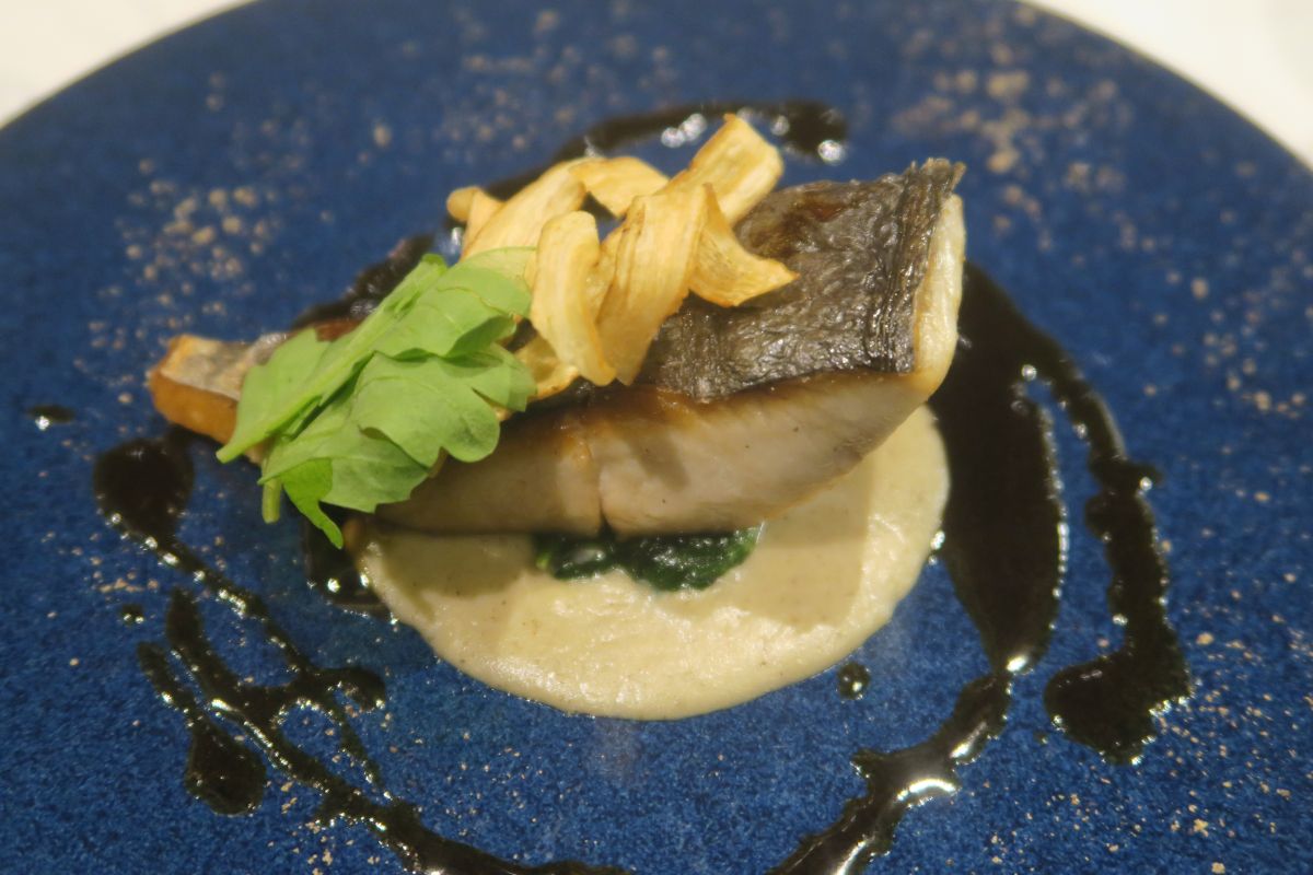 鱈のソテー 金澤春菊ゴボウのピューレとチップス ガストリックソース