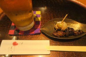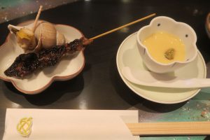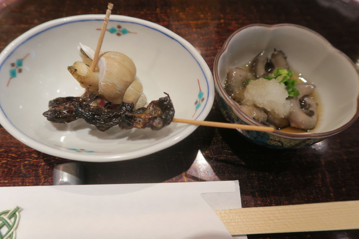 お通しバイ貝にドジョウの蒲焼き