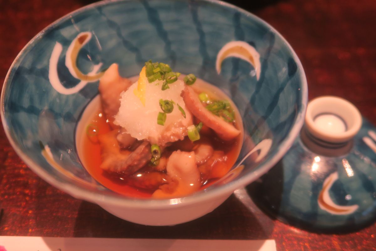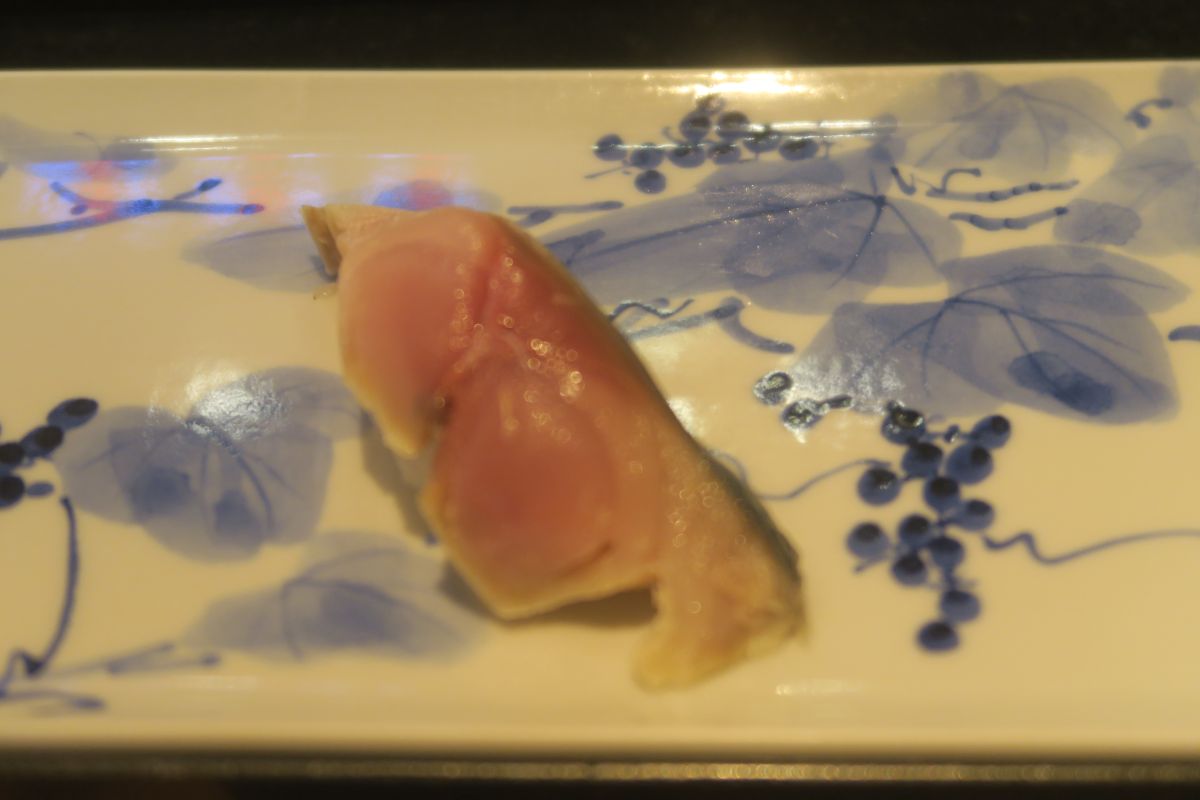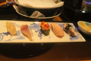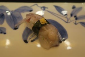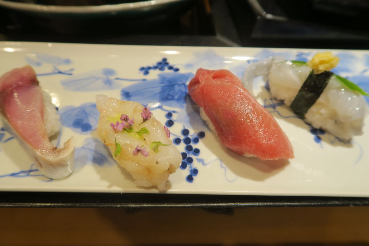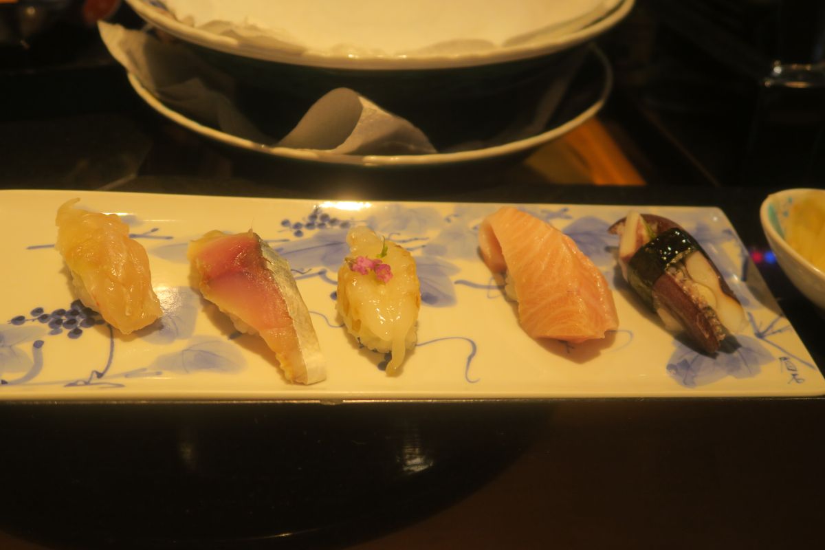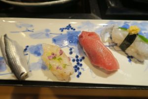 握り ゲソとマハタ、鱈と河豚の白子、煮ハマグリと鰯、赤西貝と鉄火巻き