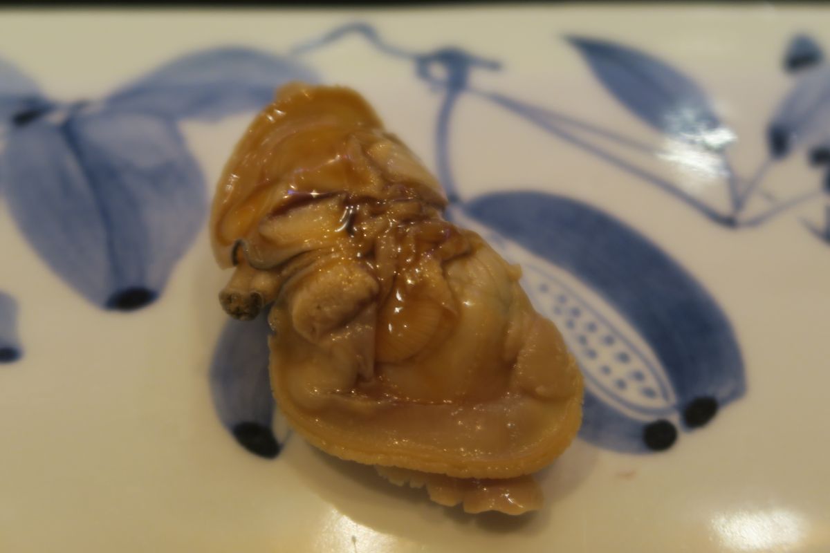 8日(日)暑い暑い日が続く。旬の岩牡蠣、輪島の縞エビで夏の疲れを癒やす。煮ハマグリ、ノドグロあぶり、赤いかのゲソもいいね。